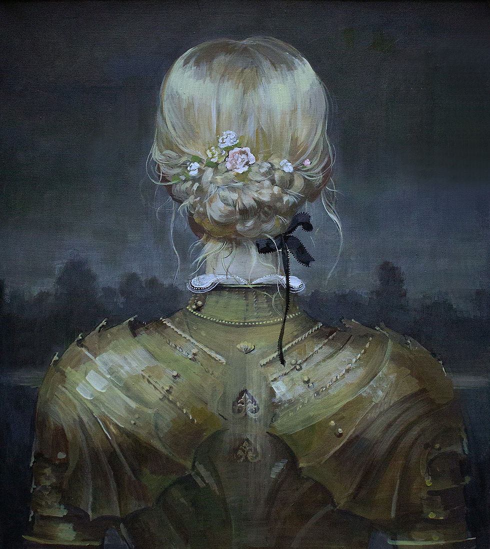 Dongni Hou paints heroines, unveiling the deepest emotional complexities of their expeditions and psyche, often nodding to the darker chambers of the human soul. Poetic introspection and reflection are evident in the moments she captures with tempera, as one cannot avoid the darkness in even the most noble of pursuits.